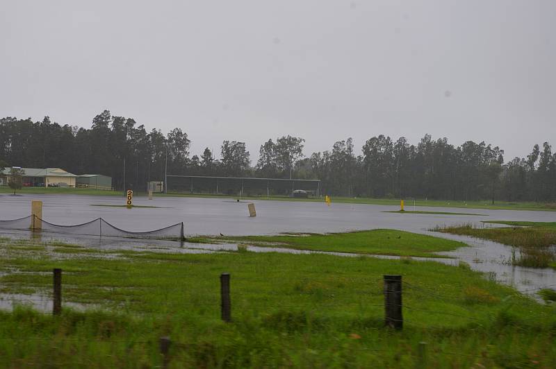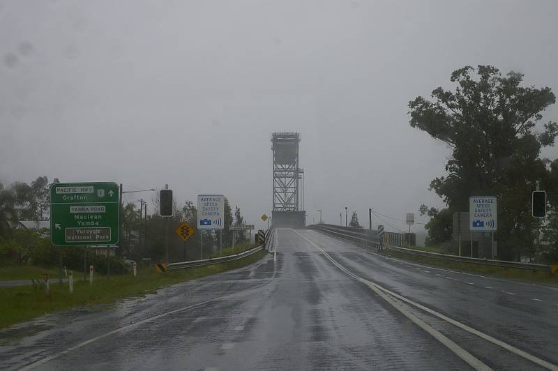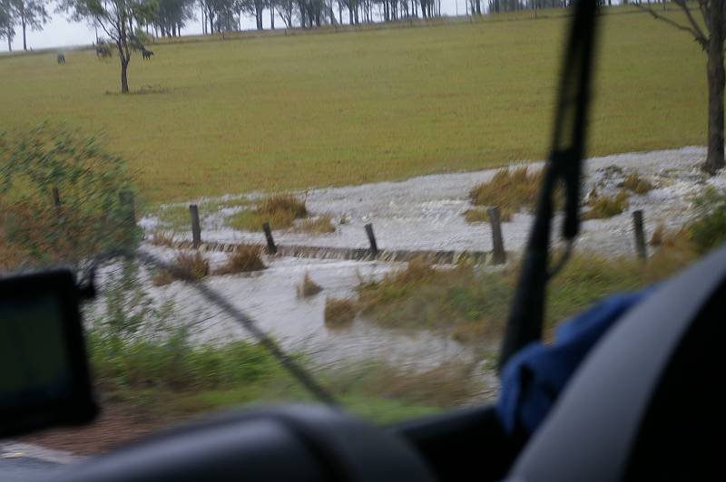 Am morgen eine kurze Pause in den Regengüssen, schnell den Strom abklemmen und weiter geht’s. Kaum sind wir unterwegs, geht’s auch wieder los. Wir beschließen bis Grafton zu fahren und dort zu entscheiden, wie es weiter gehen soll. Auf dem Weg dorthin sehen wir Bächenur Wasser, die sich in reißende Flußläufe verwandelt haben, überschwemmte Feldernur Wasser und Strassen.nur Wasser